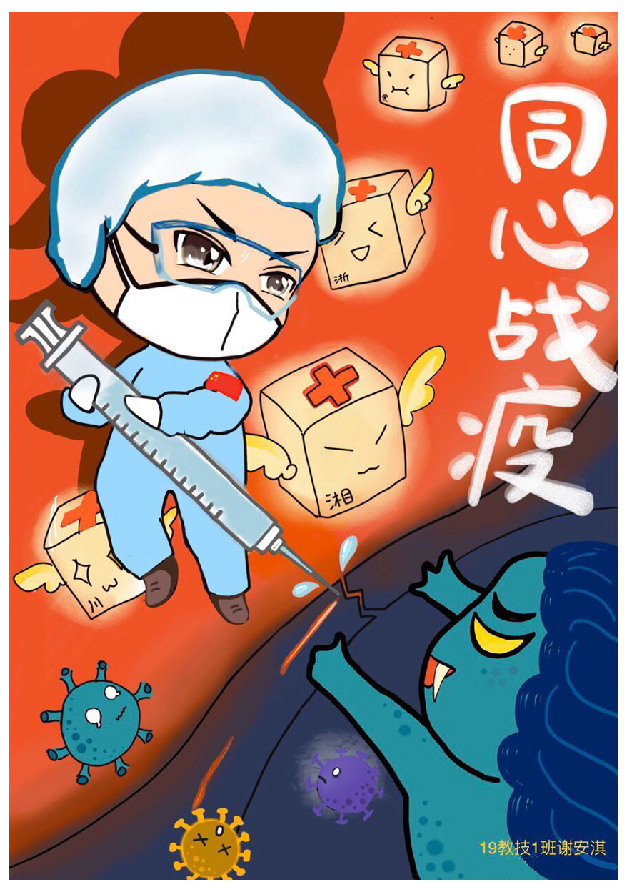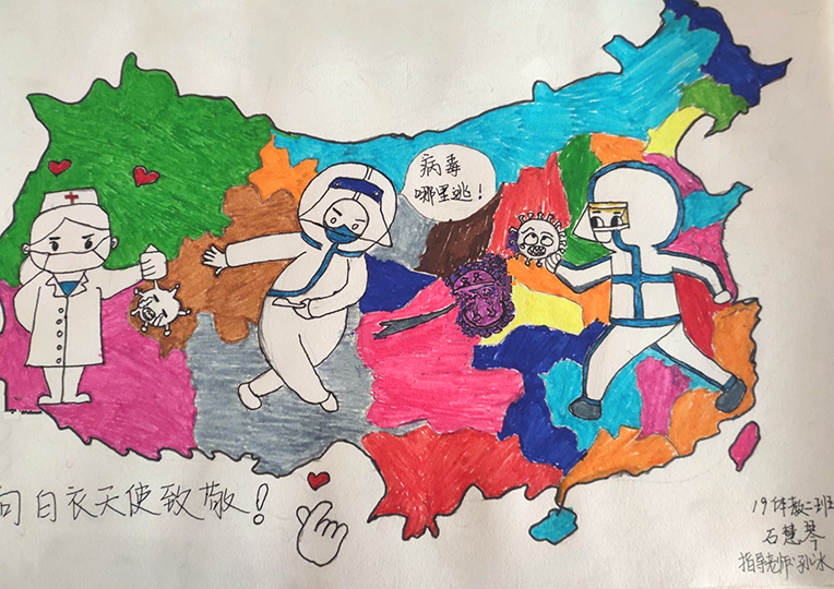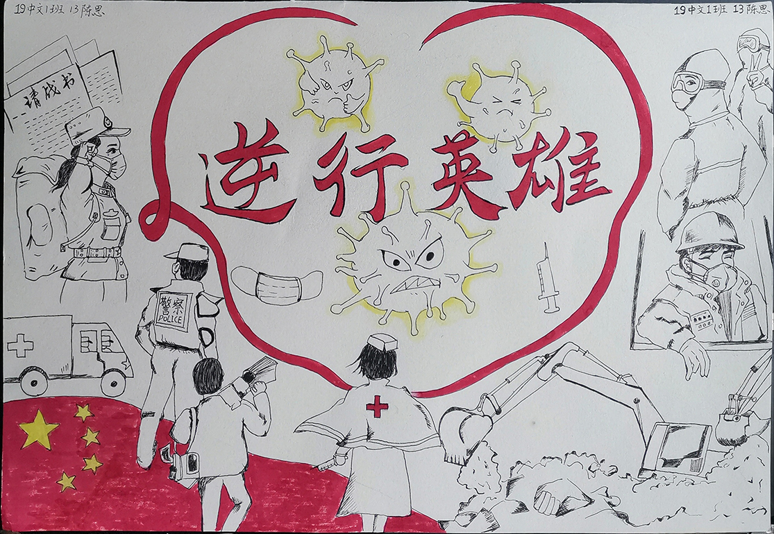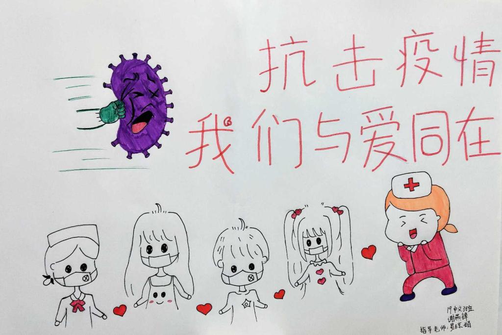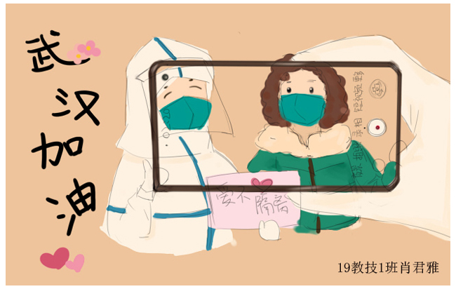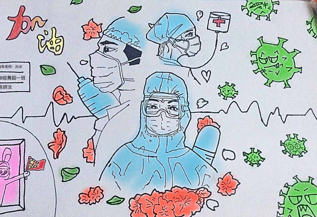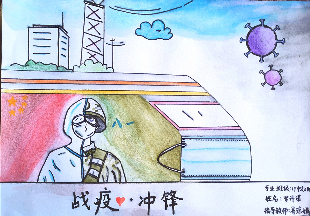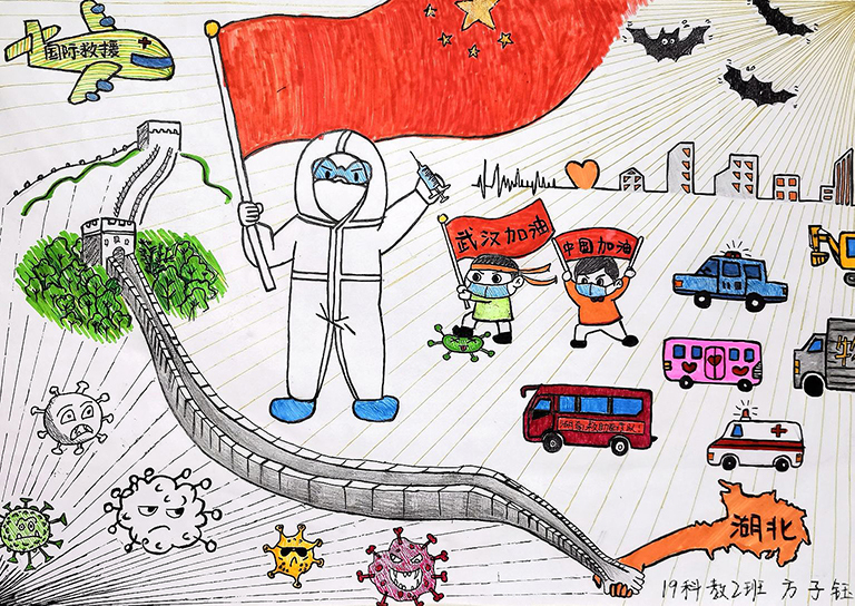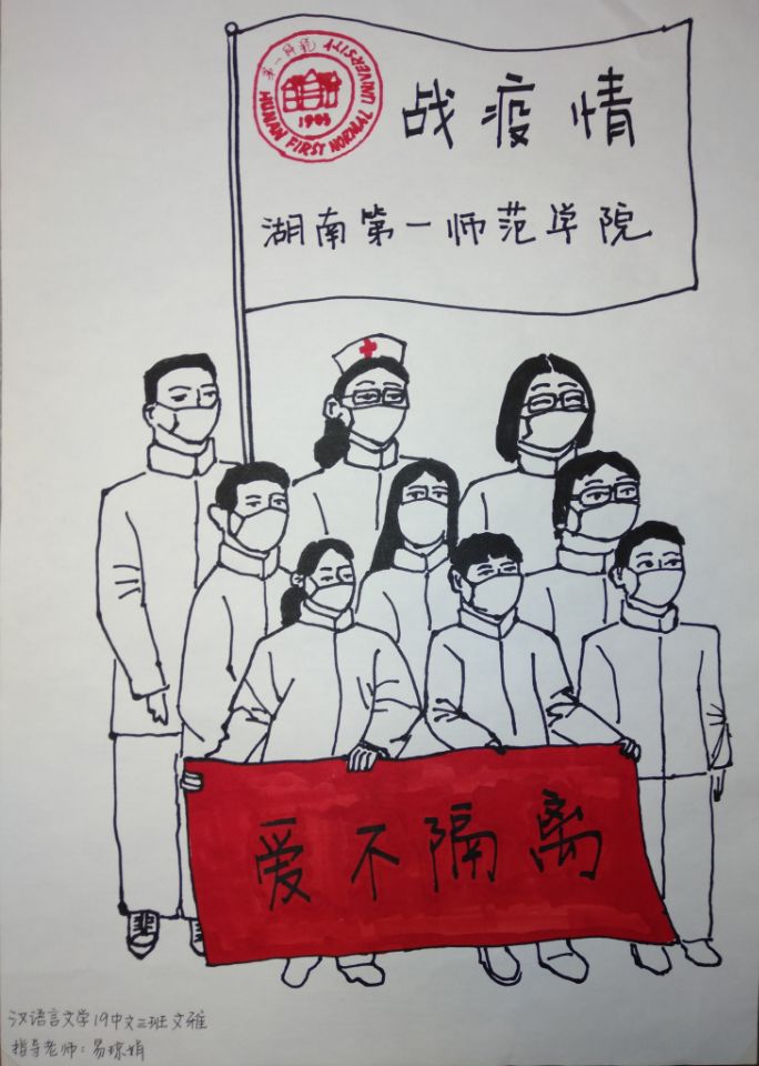 简笔画教学是《美术基础》课程内容中的重要组成部分,教学重点在于加强师范生的简笔画绘画技能,提高美术素养与多元化教学能力,为今后的教学实践打下基础。这次主题创作活动是课程组孙冰、曾素艳、谭媛元、吴瑕、易琼娟五位教师共同探究新时代课堂教学中“课程思政”的一次教学实践。针对抗击疫情期间师生们对抗疫进展与社会现象的关注,结合美术创作“以人民为中心”的指导思想,课程组五位教师通过多次研讨课程内容与授课方式,决定结合慕课平台线上教学进度与课程内容,组织所授班级包括科教、体育、音乐、应数等十个专业926名学生(师范类非美术学专业)共同参与“战疫情·爱不隔离”简笔画主题创作。同学们在掌握简笔画学习与表现规律的同时,将抗疫期间的英雄事迹、感人镜头用画笔展现,将感动之情运用隐喻、借喻、拟人或直抒胸臆等多种手法表现,表达青年的爱国情怀与内心感悟。课程组五位教师在十个班级中选出了75幅优秀作品进行线上展览,呈现出不同学科专业学生们凭借艺术的力量以“艺”抗“疫”。
