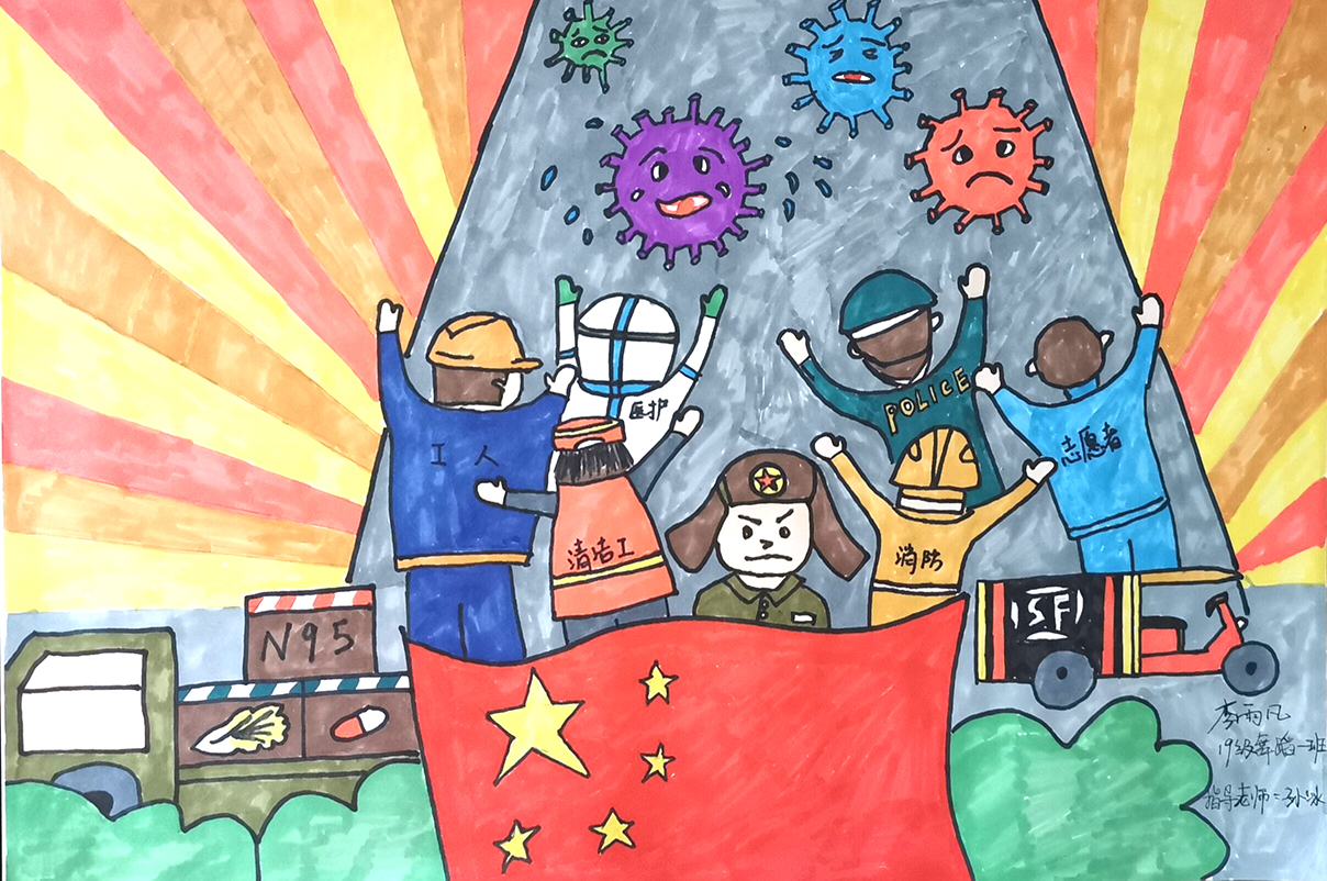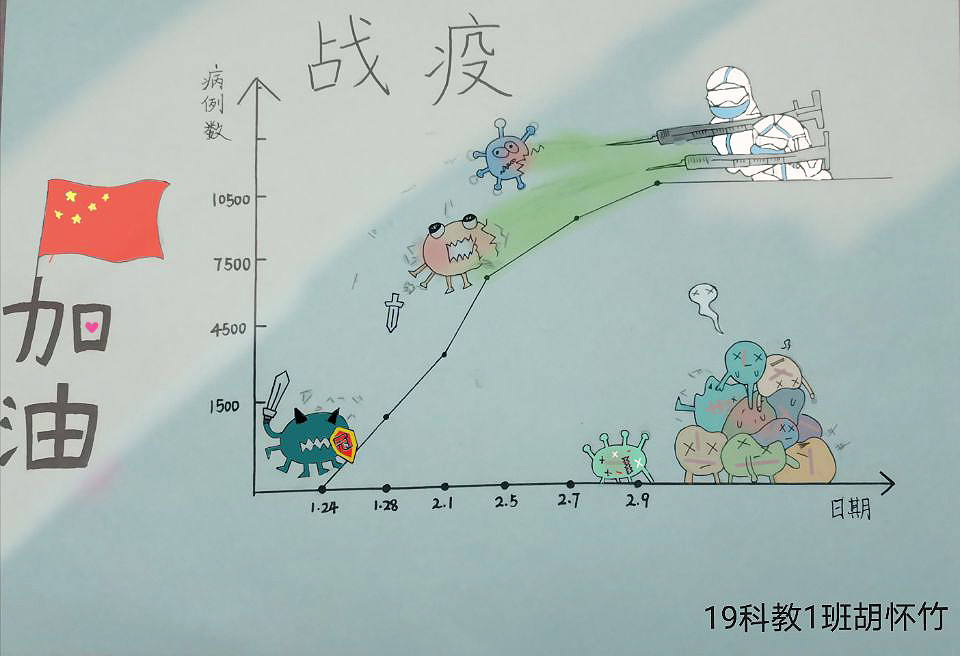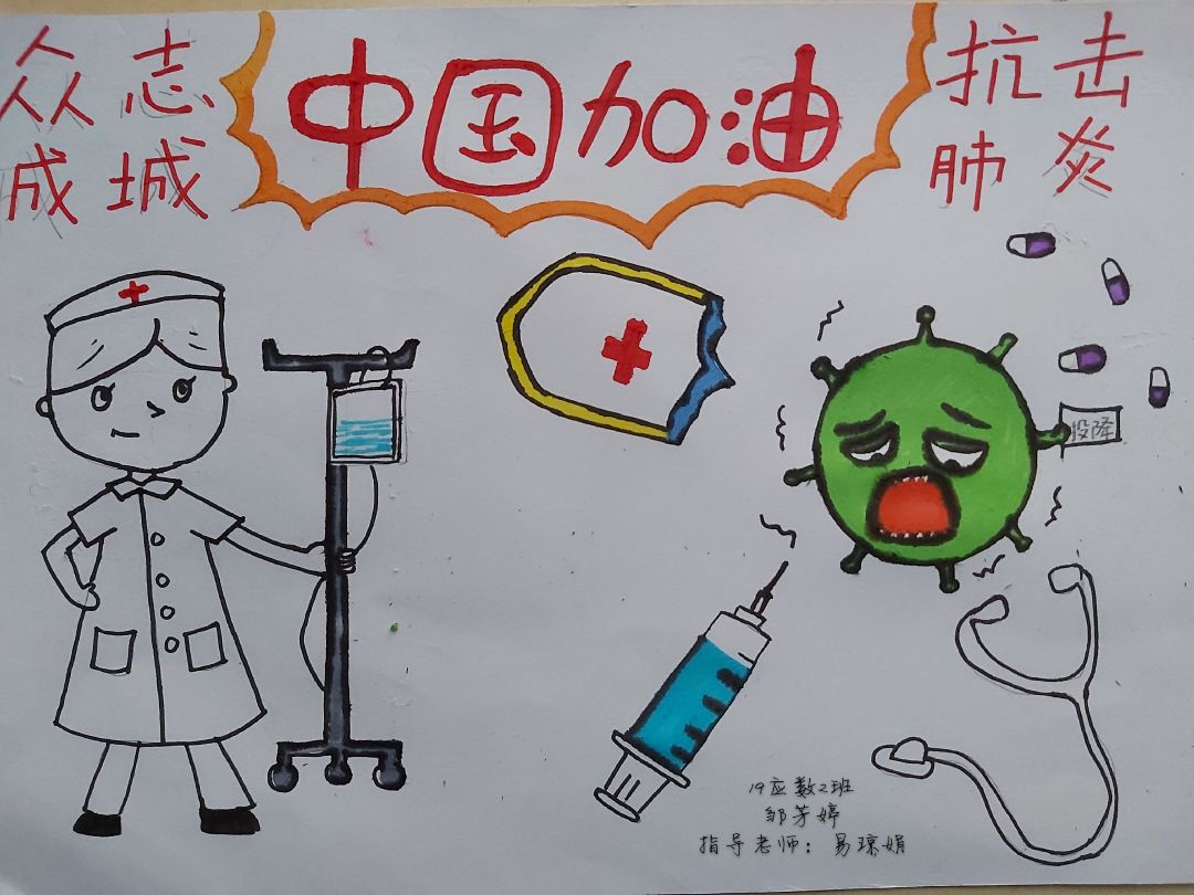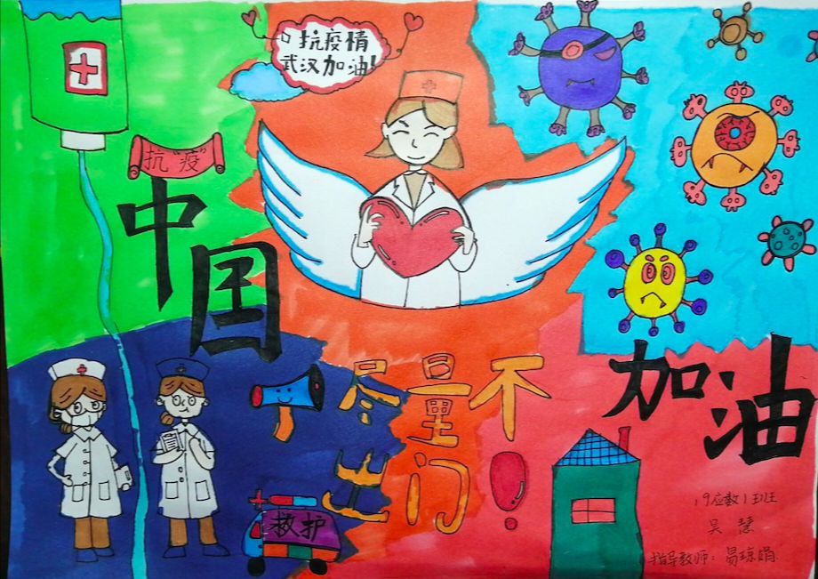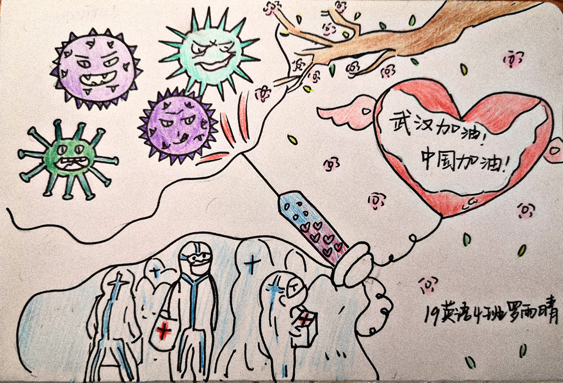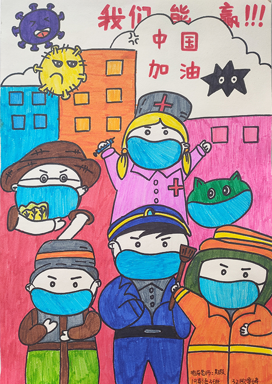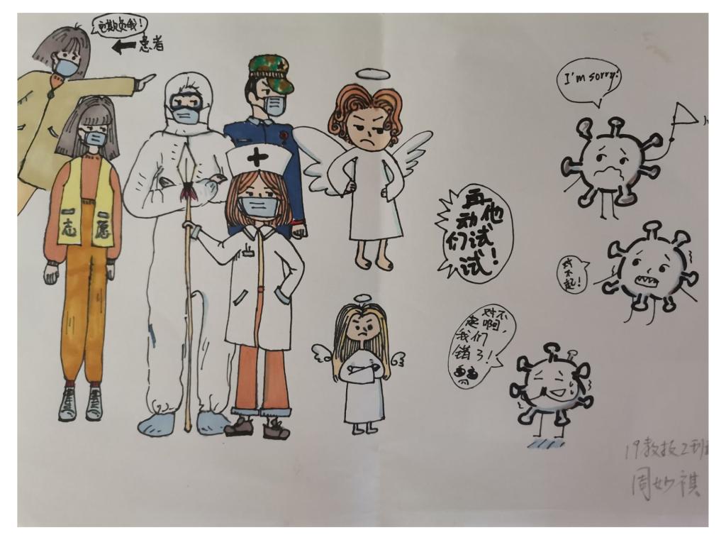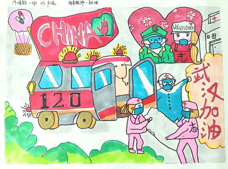 简笔画教学是《美术基础》课程内容中的重要组成部分,教学重点在于加强师范生的简笔画绘画技能,提高美术素养与多元化教学能力,为今后的教学实践打下基础。这次主题创作活动是课程组孙冰、曾素艳、谭媛元、吴瑕、易琼娟五位教师共同探究新时代课堂教学中“课程思政”的一次教学实践。针对抗击疫情期间师生们对抗疫进展与社会现象的关注,结合美术创作“以人民为中心”的指导思想,课程组五位教师通过多次研讨课程内容与授课方式,决定结合慕课平台线上教学进度与课程内容,组织所授班级包括科教、体育、音乐、应数等十个专业926名学生(师范类非美术学专业)共同参与“战疫情·爱不隔离”简笔画主题创作。同学们在掌握简笔画学习与表现规律的同时,将抗疫期间的英雄事迹、感人镜头用画笔展现,将感动之情运用隐喻、借喻、拟人或直抒胸臆等多种手法表现,表达青年的爱国情怀与内心感悟。课程组五位教师在十个班级中选出了75幅优秀作品进行线上展览,呈现出不同学科专业学生们凭借艺术的力量以“艺”抗“疫”。