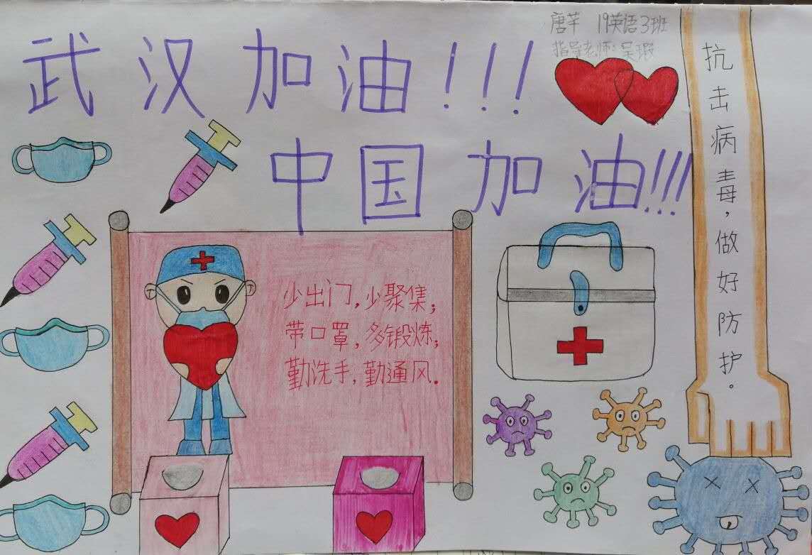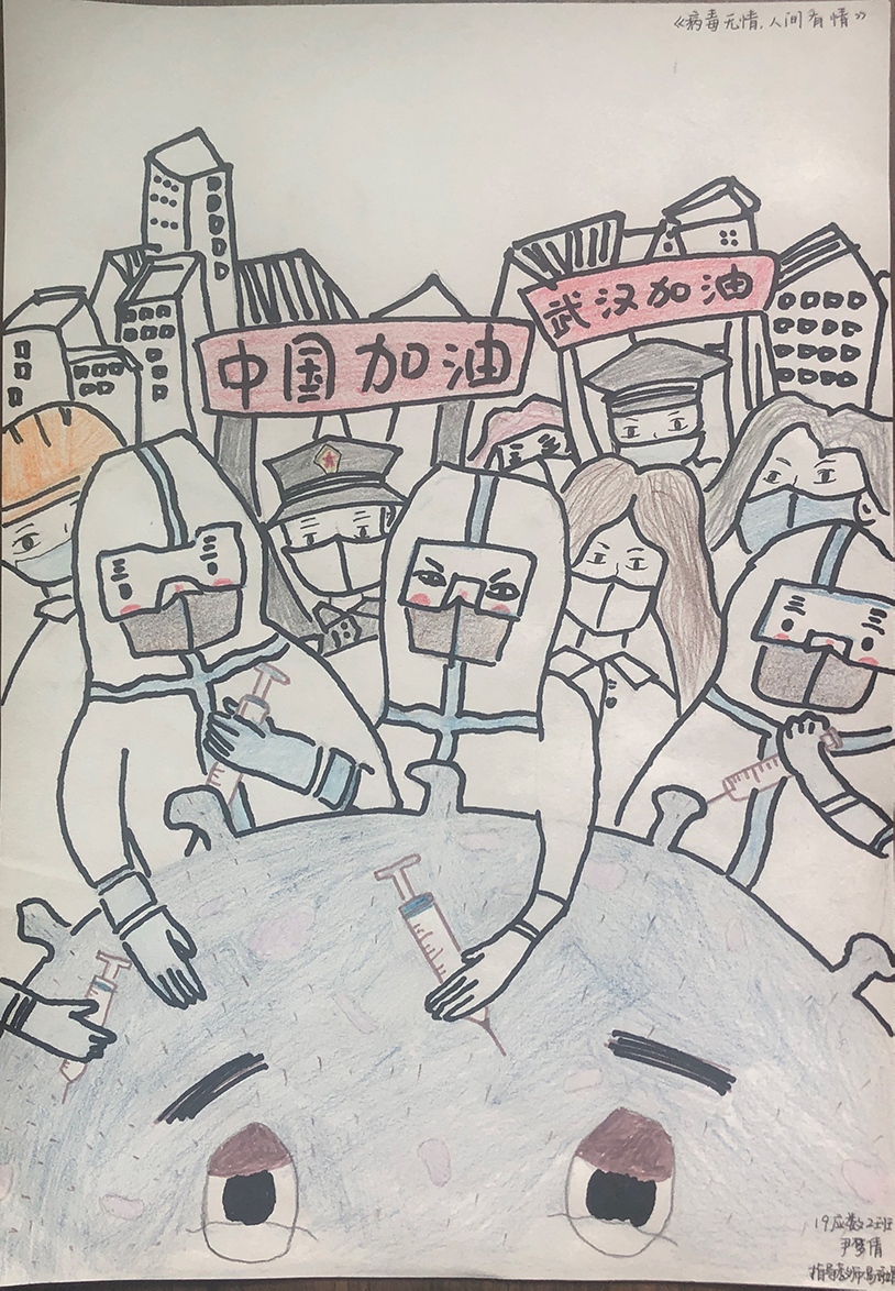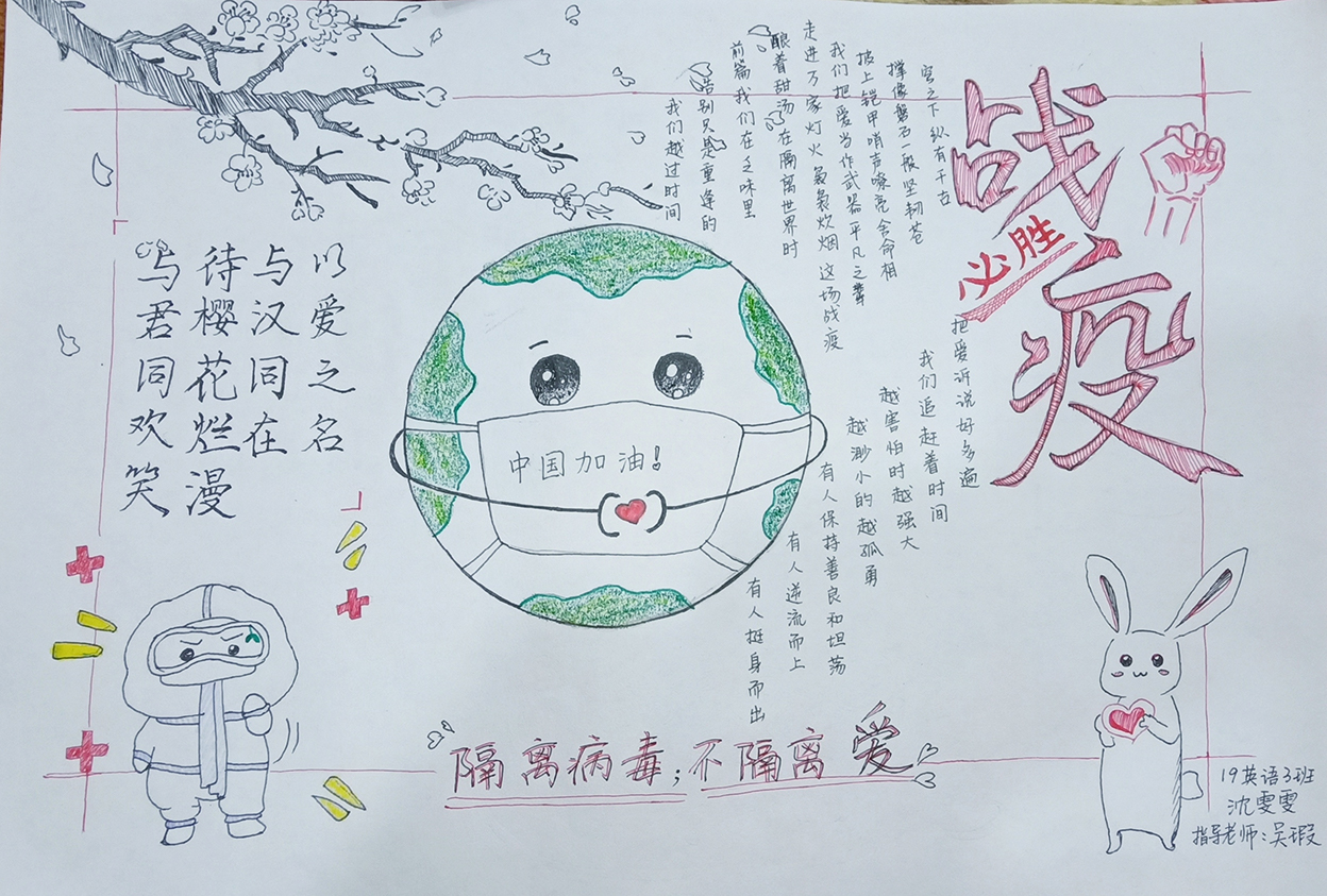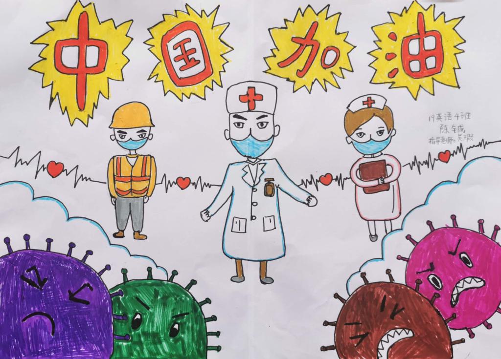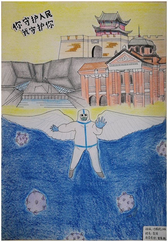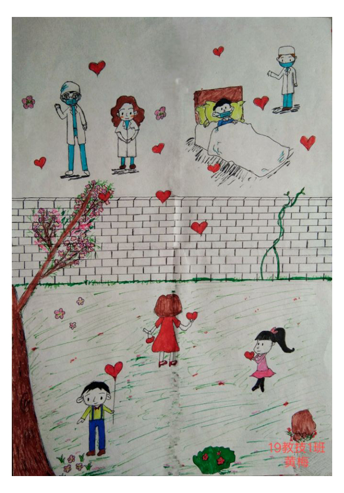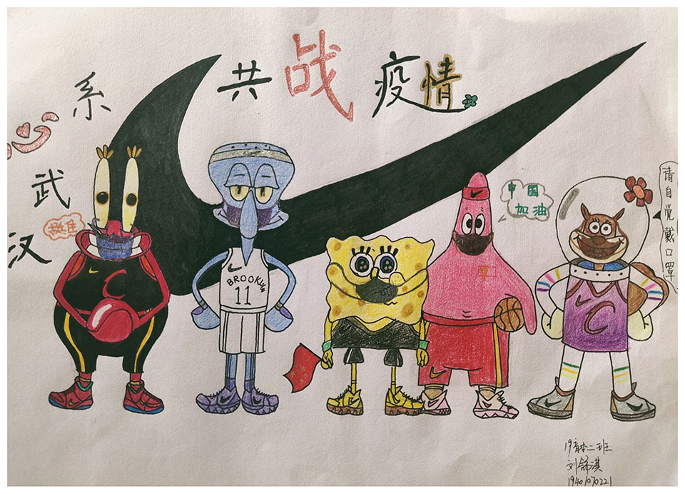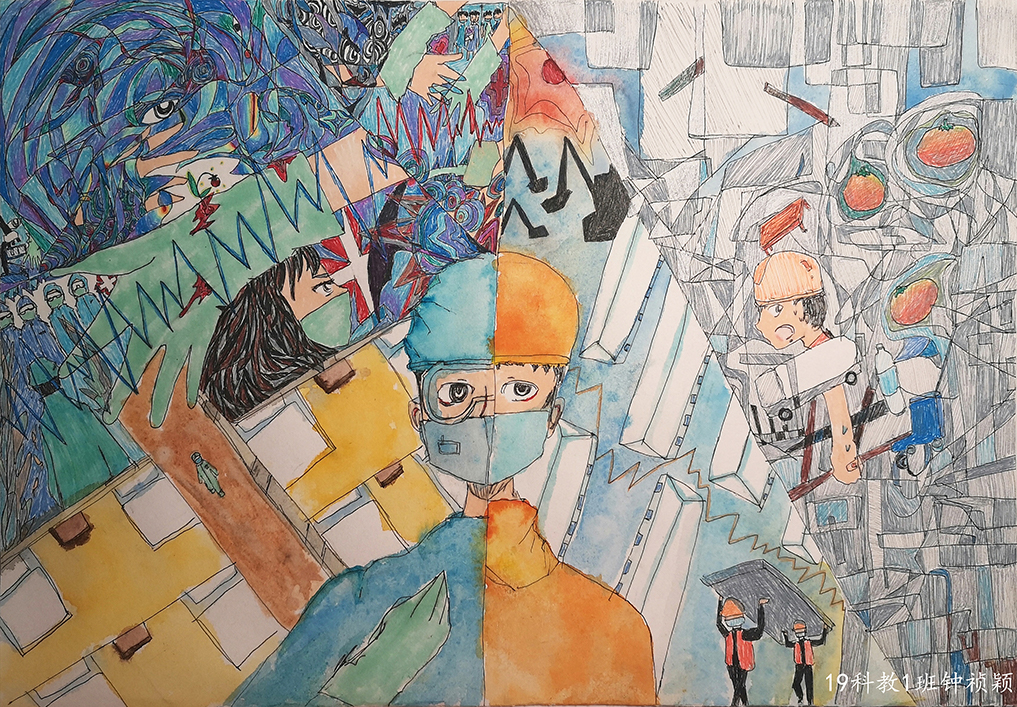 简笔画教学是《美术基础》课程内容中的重要组成部分,教学重点在于加强师范生的简笔画绘画技能,提高美术素养与多元化教学能力,为今后的教学实践打下基础。这次主题创作活动是课程组孙冰、曾素艳、谭媛元、吴瑕、易琼娟五位教师共同探究新时代课堂教学中“课程思政”的一次教学实践。针对抗击疫情期间师生们对抗疫进展与社会现象的关注,结合美术创作“以人民为中心”的指导思想,课程组五位教师通过多次研讨课程内容与授课方式,决定结合慕课平台线上教学进度与课程内容,组织所授班级包括科教、体育、音乐、应数等十个专业926名学生(师范类非美术学专业)共同参与“战疫情·爱不隔离”简笔画主题创作。同学们在掌握简笔画学习与表现规律的同时,将抗疫期间的英雄事迹、感人镜头用画笔展现,将感动之情运用隐喻、借喻、拟人或直抒胸臆等多种手法表现,表达青年的爱国情怀与内心感悟。课程组五位教师在十个班级中选出了75幅优秀作品进行线上展览,呈现出不同学科专业学生们凭借艺术的力量以“艺”抗“疫”。