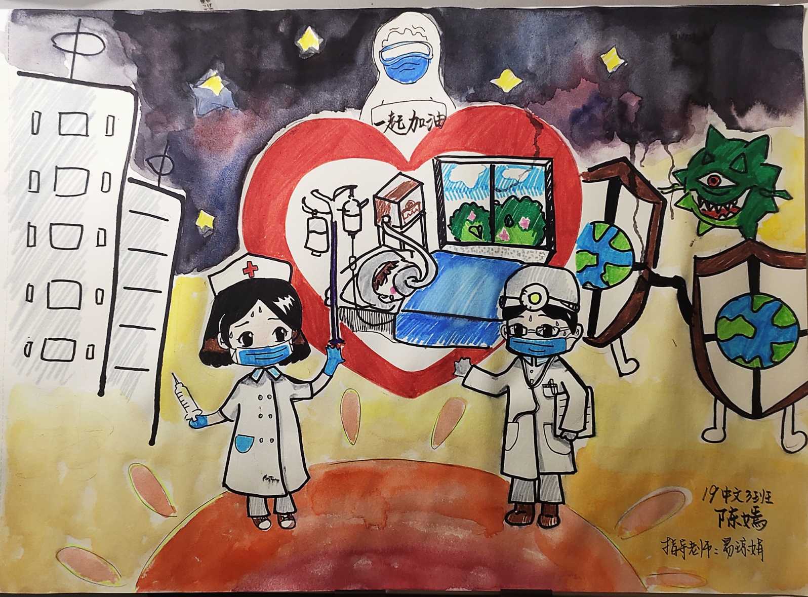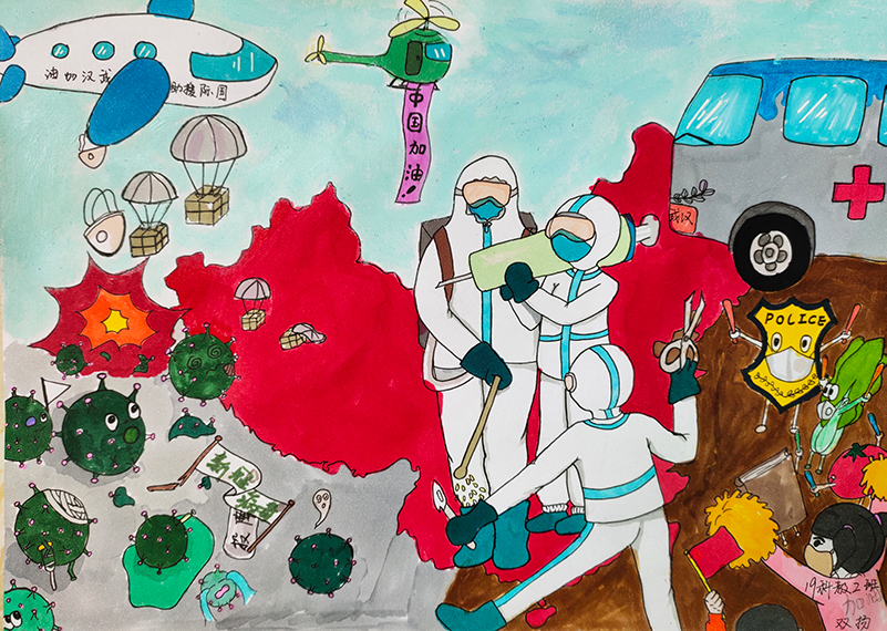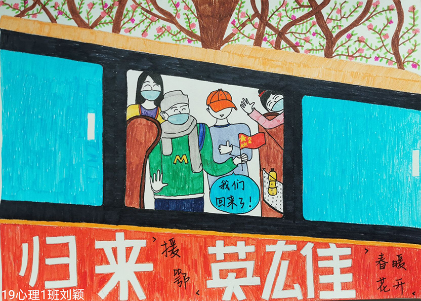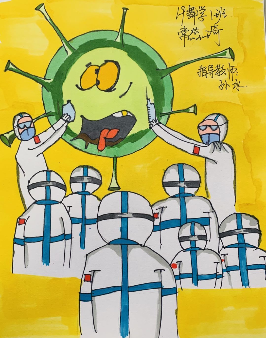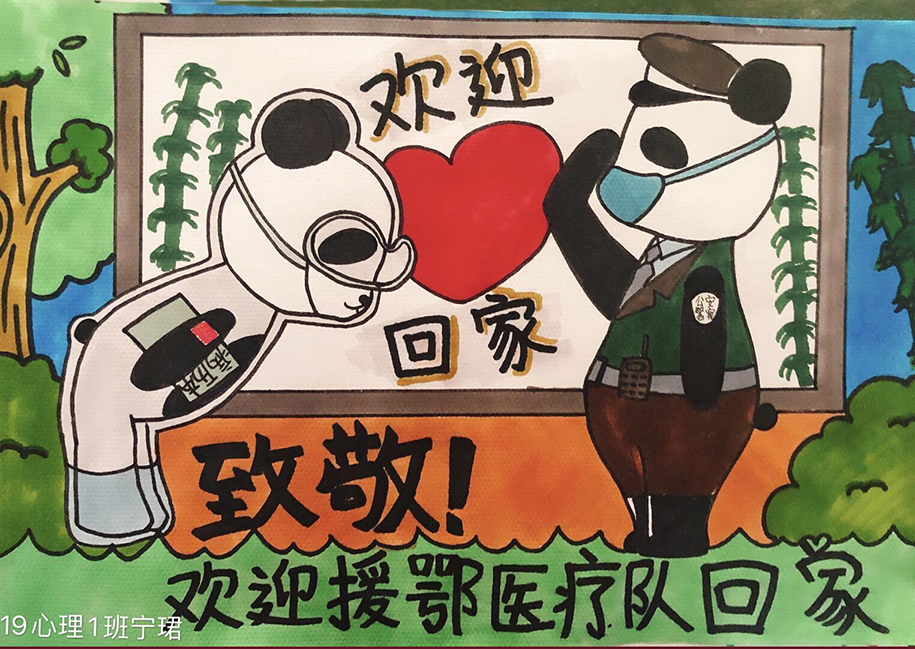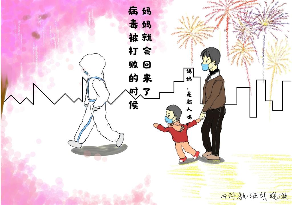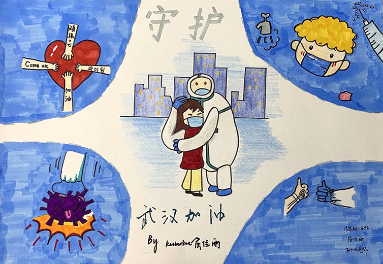 简笔画教学是《美术基础》课程内容中的重要组成部分,教学重点在于加强师范生的简笔画绘画技能,提高美术素养与多元化教学能力,为今后的教学实践打下基础。这次主题创作活动是课程组孙冰、曾素艳、谭媛元、吴瑕、易琼娟五位教师共同探究新时代课堂教学中“课程思政”的一次教学实践。针对抗击疫情期间师生们对抗疫进展与社会现象的关注,结合美术创作“以人民为中心”的指导思想,课程组五位教师通过多次研讨课程内容与授课方式,决定结合慕课平台线上教学进度与课程内容,组织所授班级包括科教、体育、音乐、应数等十个专业926名学生(师范类非美术学专业)共同参与“战疫情·爱不隔离”简笔画主题创作。同学们在掌握简笔画学习与表现规律的同时,将抗疫期间的英雄事迹、感人镜头用画笔展现,将感动之情运用隐喻、借喻、拟人或直抒胸臆等多种手法表现,表达青年的爱国情怀与内心感悟。课程组五位教师在十个班级中选出了75幅优秀作品进行线上展览,呈现出不同学科专业学生们凭借艺术的力量以“艺”抗“疫”。