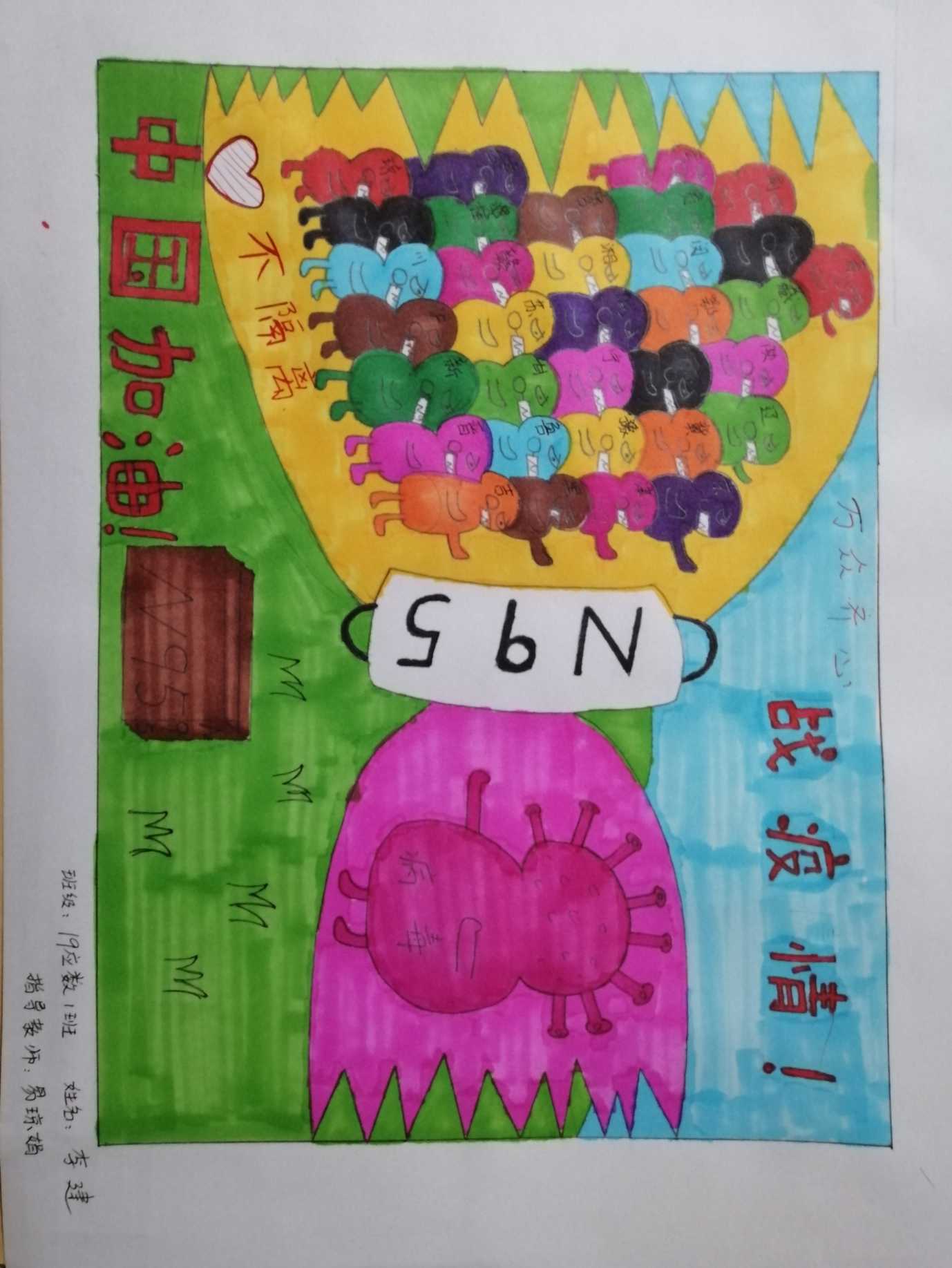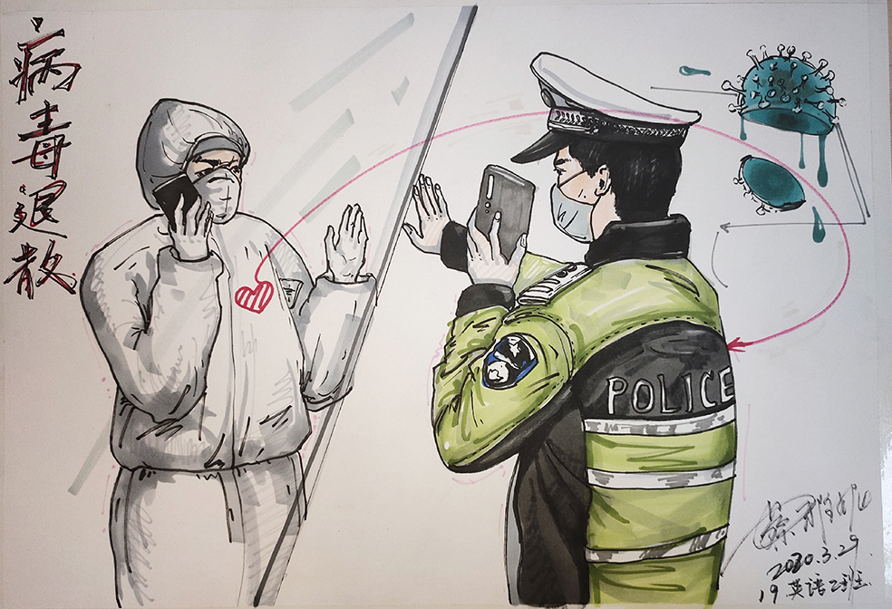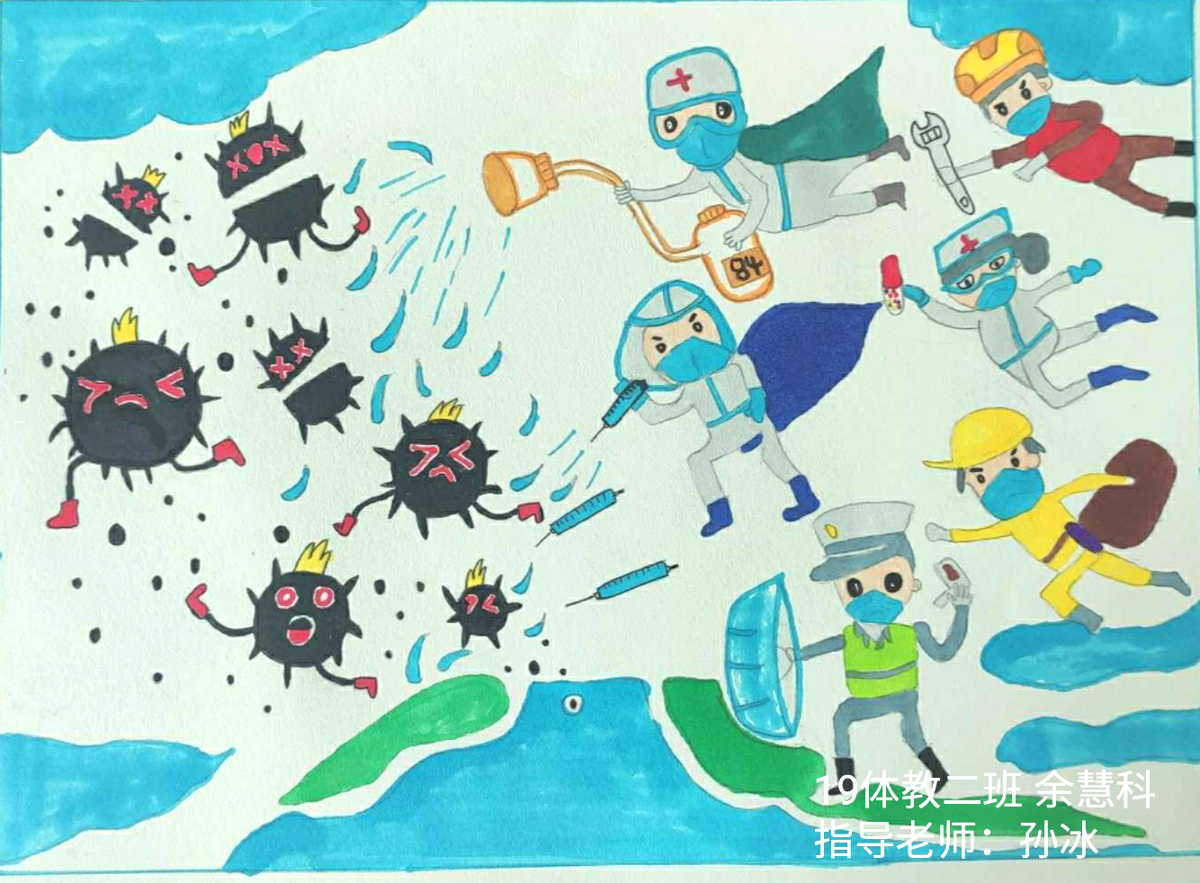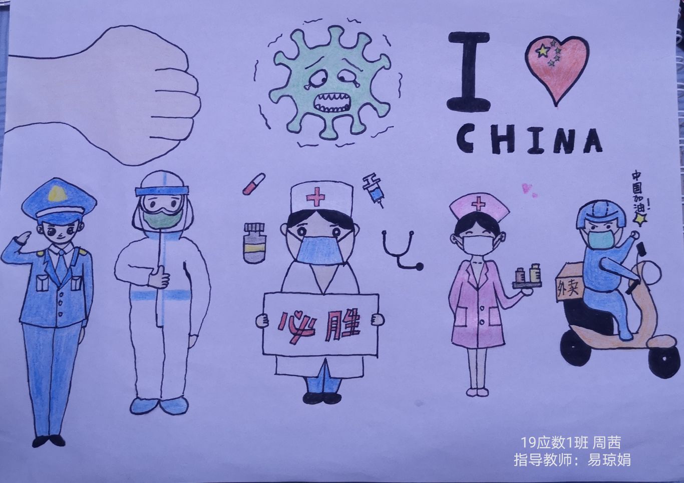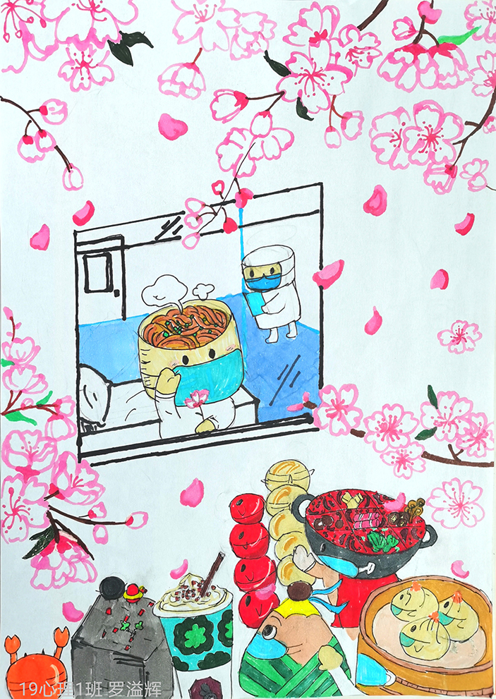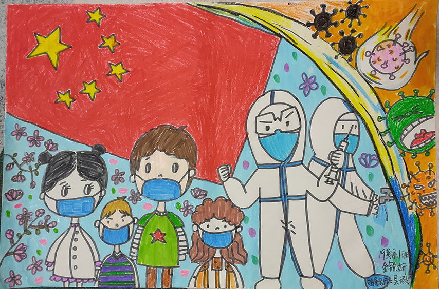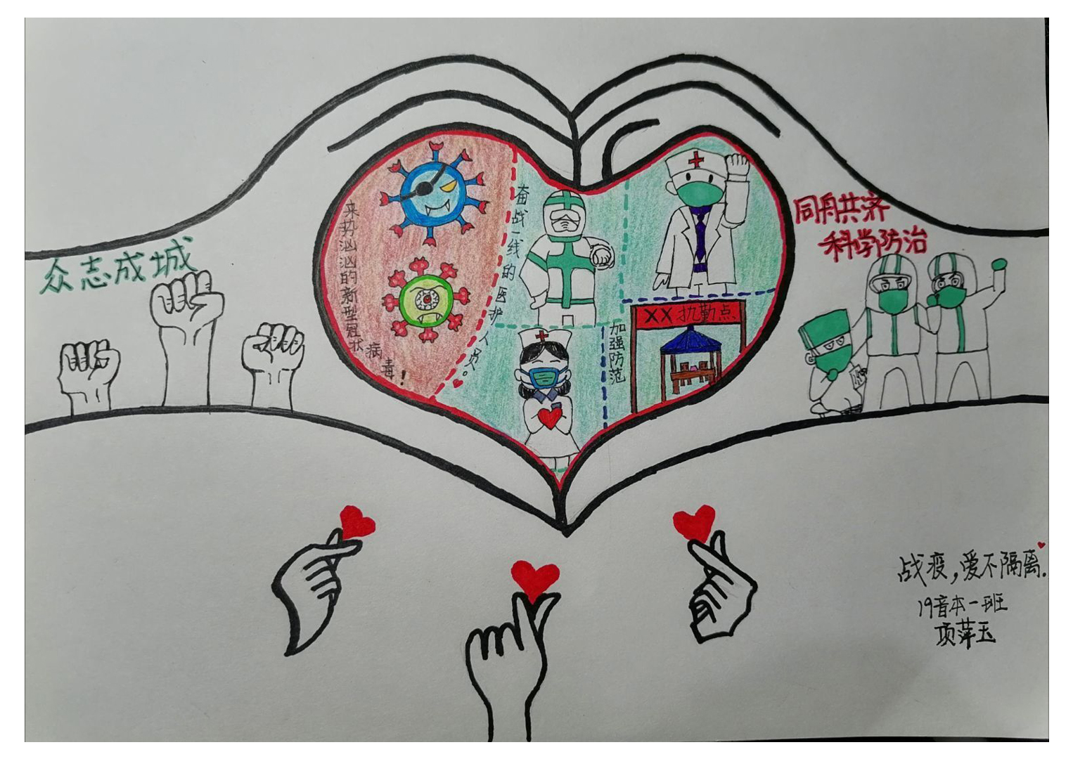 简笔画教学是《美术基础》课程内容中的重要组成部分,教学重点在于加强师范生的简笔画绘画技能,提高美术素养与多元化教学能力,为今后的教学实践打下基础。这次主题创作活动是课程组孙冰、曾素艳、谭媛元、吴瑕、易琼娟五位教师共同探究新时代课堂教学中“课程思政”的一次教学实践。针对抗击疫情期间师生们对抗疫进展与社会现象的关注,结合美术创作“以人民为中心”的指导思想,课程组五位教师通过多次研讨课程内容与授课方式,决定结合慕课平台线上教学进度与课程内容,组织所授班级包括科教、体育、音乐、应数等十个专业926名学生(师范类非美术学专业)共同参与“战疫情·爱不隔离”简笔画主题创作。同学们在掌握简笔画学习与表现规律的同时,将抗疫期间的英雄事迹、感人镜头用画笔展现,将感动之情运用隐喻、借喻、拟人或直抒胸臆等多种手法表现,表达青年的爱国情怀与内心感悟。课程组五位教师在十个班级中选出了75幅优秀作品进行线上展览,呈现出不同学科专业学生们凭借艺术的力量以“艺”抗“疫”。