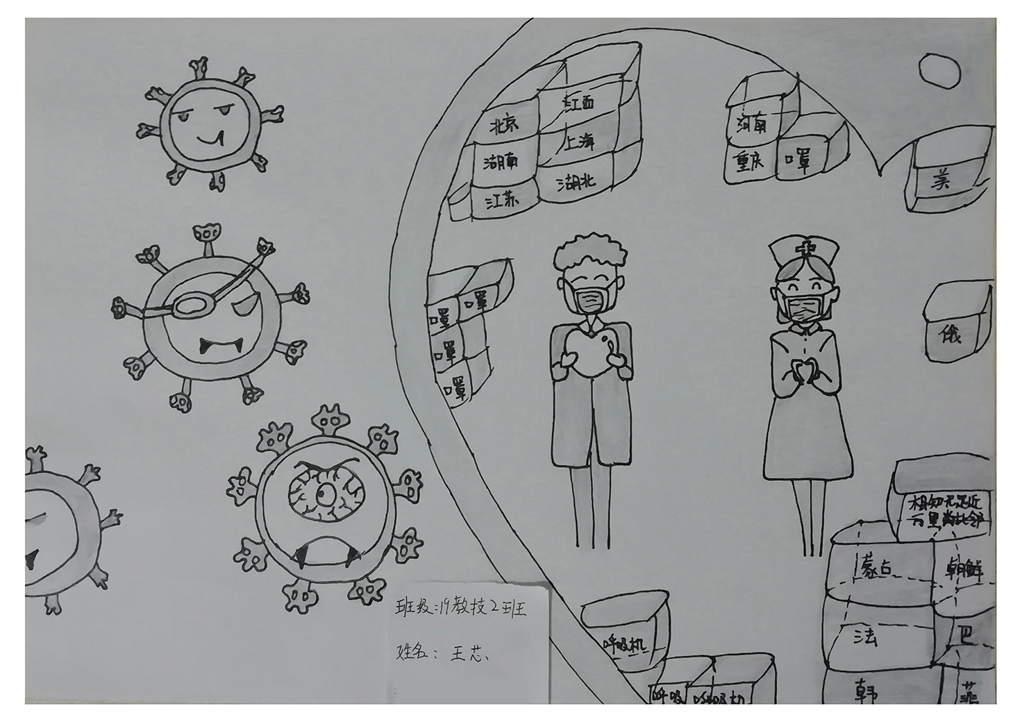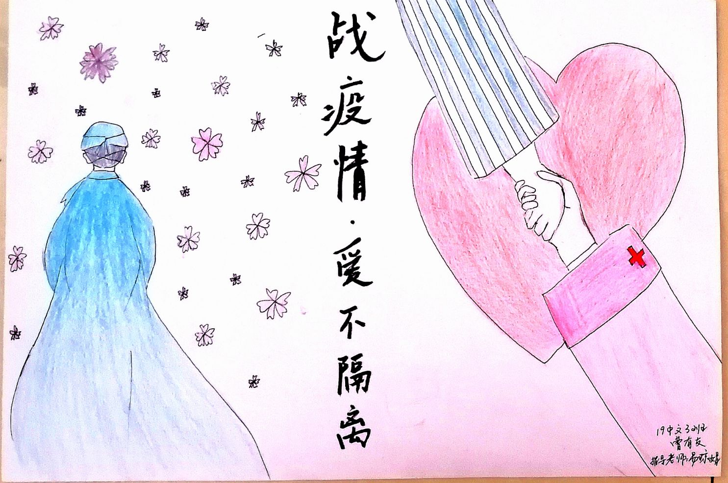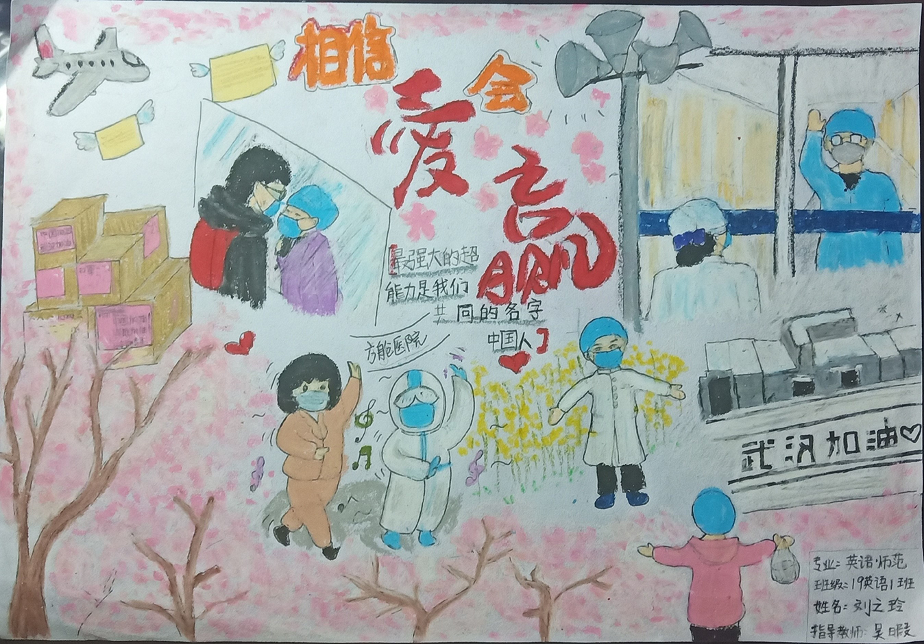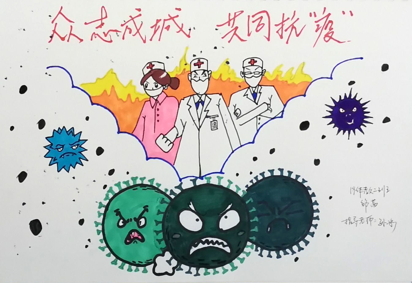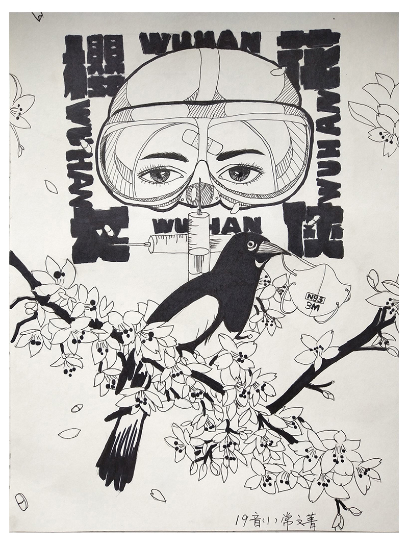 简笔画教学是《美术基础》课程内容中的重要组成部分,教学重点在于加强师范生的简笔画绘画技能,提高美术素养与多元化教学能力,为今后的教学实践打下基础。这次主题创作活动是课程组孙冰、曾素艳、谭媛元、吴瑕、易琼娟五位教师共同探究新时代课堂教学中“课程思政”的一次教学实践。针对抗击疫情期间师生们对抗疫进展与社会现象的关注,结合美术创作“以人民为中心”的指导思想,课程组五位教师通过多次研讨课程内容与授课方式,决定结合慕课平台线上教学进度与课程内容,组织所授班级包括科教、体育、音乐、应数等十个专业926名学生(师范类非美术学专业)共同参与“战疫情·爱不隔离”简笔画主题创作。同学们在掌握简笔画学习与表现规律的同时,将抗疫期间的英雄事迹、感人镜头用画笔展现,将感动之情运用隐喻、借喻、拟人或直抒胸臆等多种手法表现,表达青年的爱国情怀与内心感悟。课程组五位教师在十个班级中选出了75幅优秀作品进行线上展览,呈现出不同学科专业学生们凭借艺术的力量以“艺”抗“疫”。