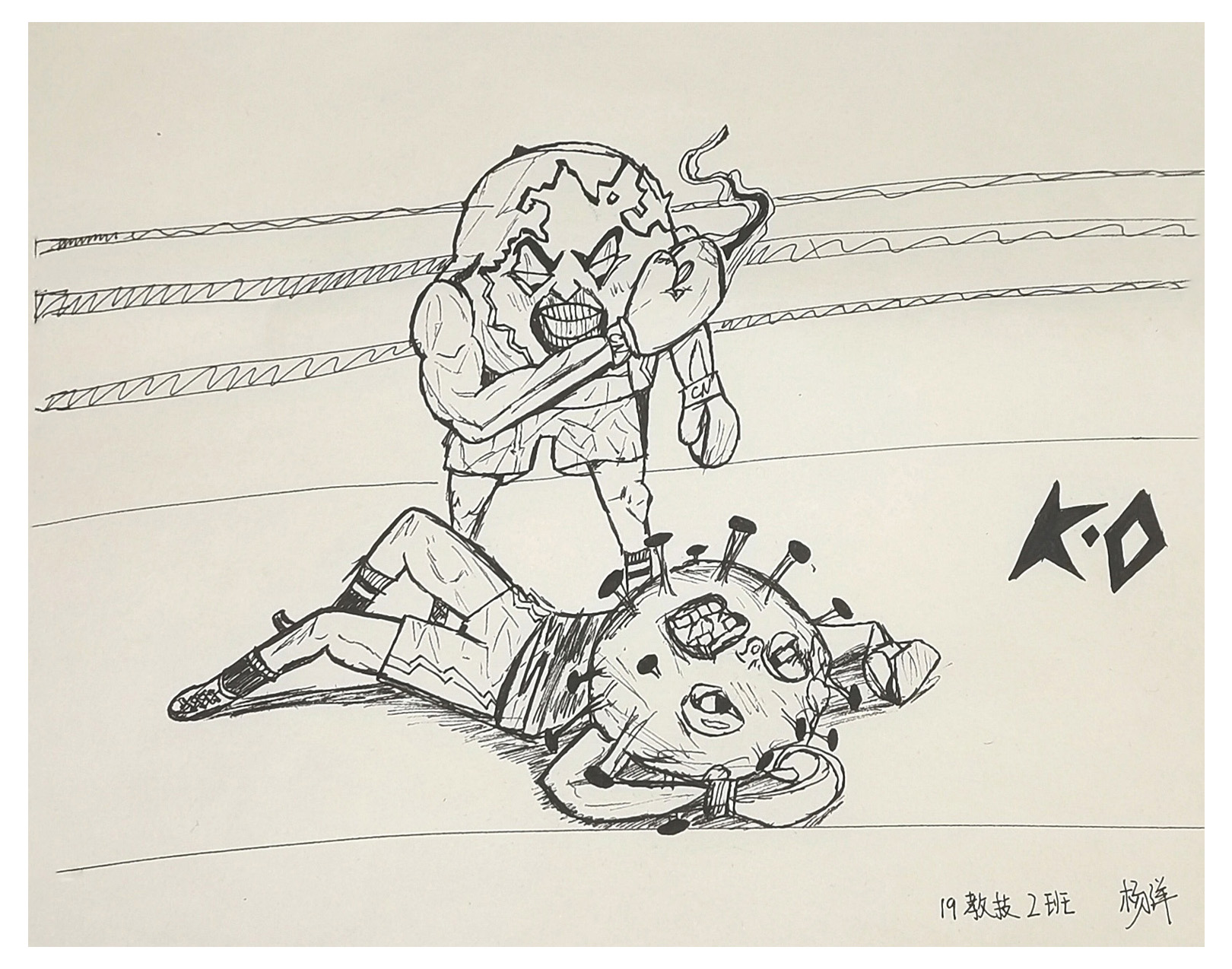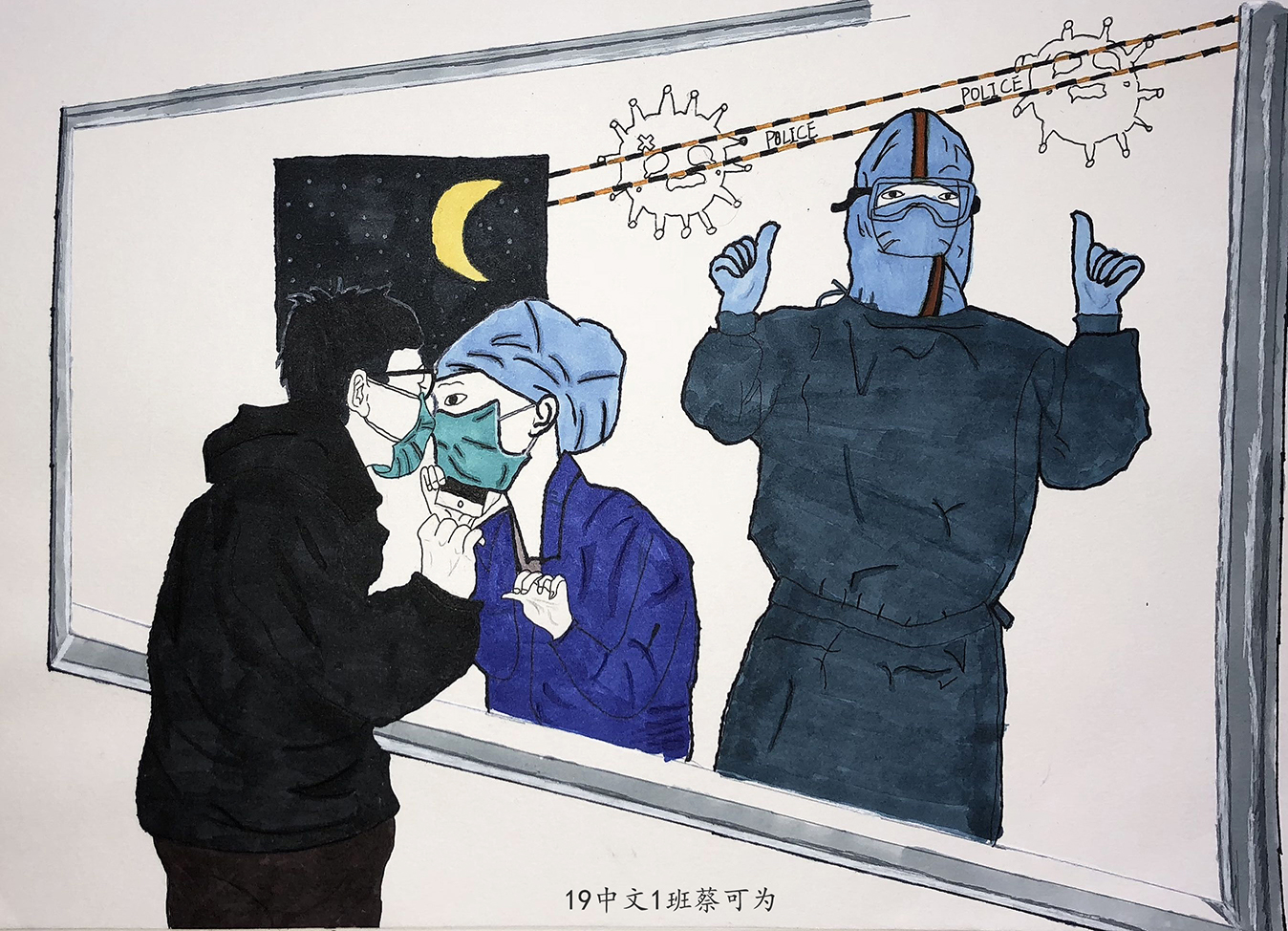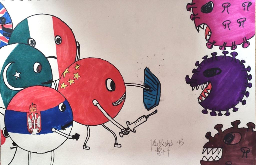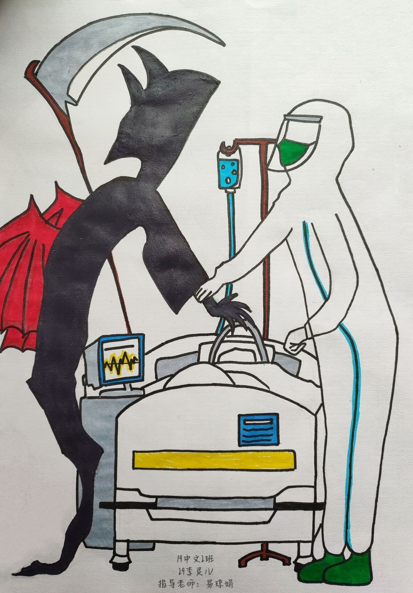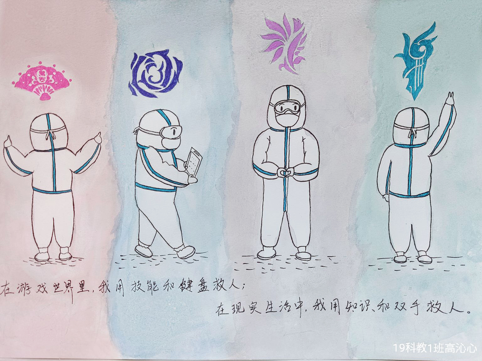 简笔画教学是《美术基础》课程内容中的重要组成部分,教学重点在于加强师范生的简笔画绘画技能,提高美术素养与多元化教学能力,为今后的教学实践打下基础。这次主题创作活动是课程组孙冰、曾素艳、谭媛元、吴瑕、易琼娟五位教师共同探究新时代课堂教学中“课程思政”的一次教学实践。针对抗击疫情期间师生们对抗疫进展与社会现象的关注,结合美术创作“以人民为中心”的指导思想,课程组五位教师通过多次研讨课程内容与授课方式,决定结合慕课平台线上教学进度与课程内容,组织所授班级包括科教、体育、音乐、应数等十个专业926名学生(师范类非美术学专业)共同参与“战疫情·爱不隔离”简笔画主题创作。同学们在掌握简笔画学习与表现规律的同时,将抗疫期间的英雄事迹、感人镜头用画笔展现,将感动之情运用隐喻、借喻、拟人或直抒胸臆等多种手法表现,表达青年的爱国情怀与内心感悟。课程组五位教师在十个班级中选出了75幅优秀作品进行线上展览,呈现出不同学科专业学生们凭借艺术的力量以“艺”抗“疫”。