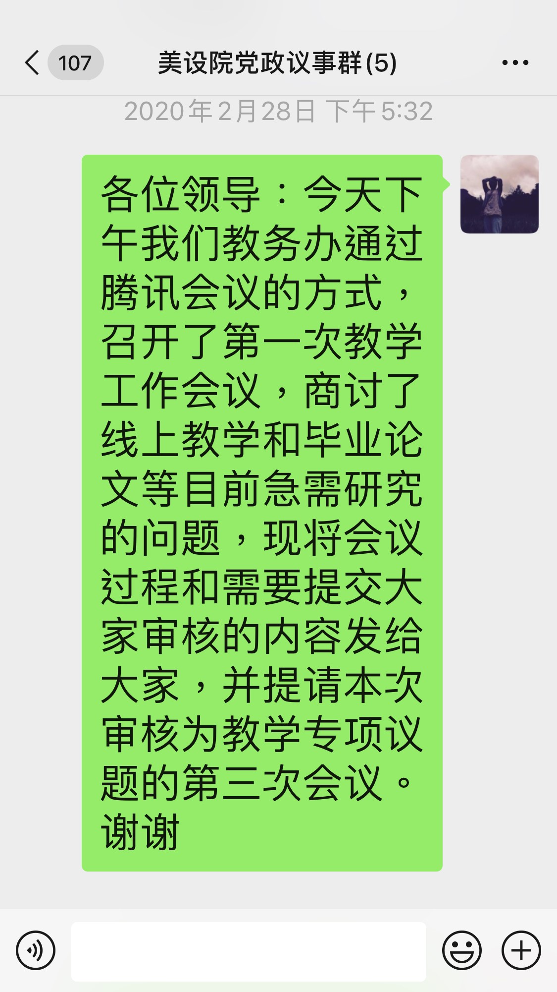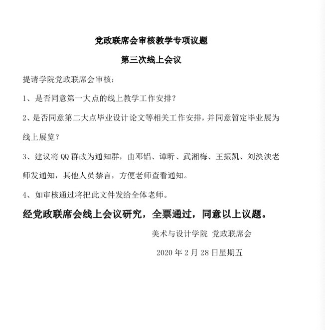 2020年2月15日至3月6日,伟的国际1946bv分别在线上召开四次教学专项党政联席会议,审议教学负责人提交了《伟的国际1946bv疫情防控期间在线教学与组织管理工作方案》、《伟的国际1946bv教师线上教学实施与课程建设一览表》、《伟的国际1946bv线上教学督导计划》等文件,明确“以课程组为单位,教学方式灵活多样,平台选择以简单易操作,保障教学为主”的工作思路。审定了全院教师、所有课程的线上教学初步计划,选用平台情况等。要求课程组内统一教学方式,课程组负责人负责填报实施情况,相同课程同平台上课,同头课教师资源互享,协同工作模式。确定了开学前试课工作安排;线上教学督导方案;教学材料要求;毕业论文实施方法;毕业作品展的调整等。从宏观到微观,层层细化,逐步落实了我院线上教学的具体工作,为我院线上教学的顺利实施奠定了基础。
