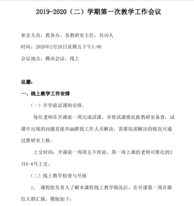 在学院党总支的指导下,在党政班子的积极支持下,我院教学组织工作顺利开展。在疫情防控期间,由教学负责人提交教学工作方案,院部党政联席会议召开了四次线上教学专项工作会议,审核通过了院部线上教学实施的各项方案,从宏观层面布局,确保线上教学工作顺利开展。