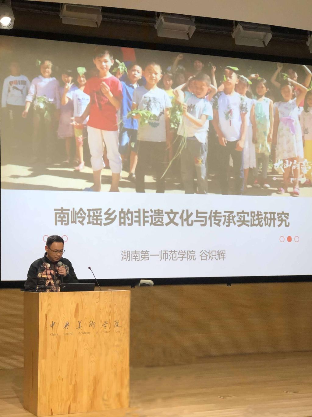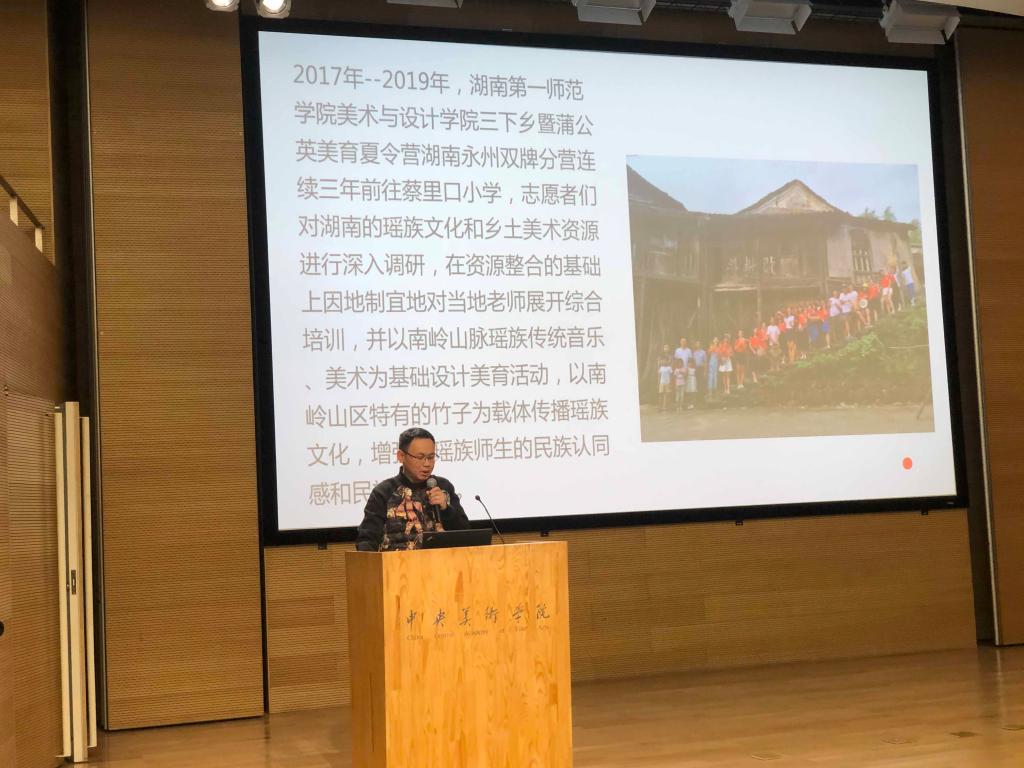 谷炽辉老师介绍导师工作坊工作成果并进行“南岭瑶乡的非遗文化与传承实践研究”主题演讲。主题演讲汇报了伟的国际1946bv持续三年在湖南省双牌县蔡里口小学开展的美育夏令营的工作情况,从用教育的方法促进瑶族文化在瑶族农村地区的传承和发展、将瑶族民间文化引入美术课堂和寻找资源为我所用、扩大活动影响力三个方面展开,最后提出因为美育夏令营等各方面的共同努力,一所湖南和广西交界的偏远村小在2019年9月10日获得了国家教育部“全国教育系统先进集体”的荣誉称号,引起了与会者的广泛兴趣,得到了他们的高度赞誉。他们一致认为,美育夏令营很有成效,向孩子们传承了丰富的民间美术知识,促进了教育公平,为基层乡村教师培训了美育能力,提升了校园环境,南岭瑶乡的非遗文化得到了较好的保护和传承。