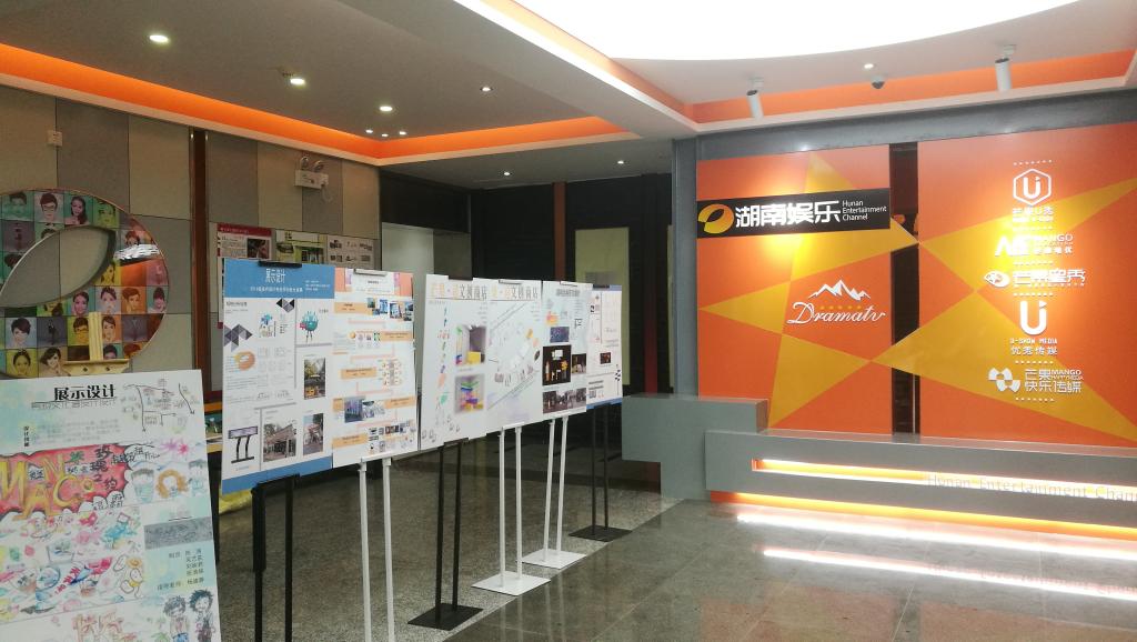 这一场教学环节与电视媒体的“偶遇”源于我院环境设计专业的一门展示设计课程以及湖南台旧址的环境改造工程项目。设计专业课程需要项目主题为依托,增加学生的实操能力;媒体办公场地环境的提升也期待年轻人天马行空的灵感注入。在多方努力和协同合作的基础上,一系列以湖南台旧址环境改造为宏观主题的室内外空间展示设计方案逐渐在学生设计团队的笔下成形。虽然“未来的设计师们”技艺还有待提升,但得到了湖南台娱乐频道领导和前辈的大力支持和帮助,在课程进行的过程中多次来我院讲座和辅导,之后的课程作业汇报也一并出席并参与了讲评互动。最终使得这次的展示、互动和交流座谈水到渠成。