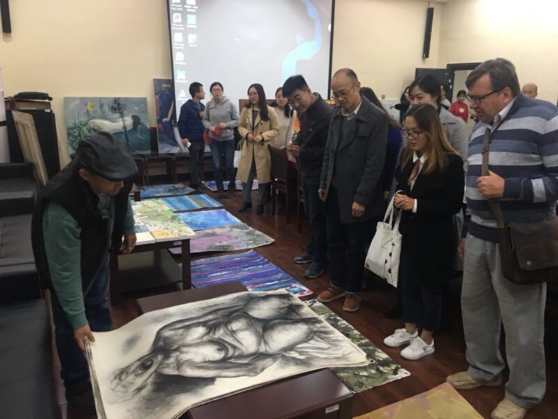 彼得洛夫教授仔细观赏了美术学专业部分师生的绘画作品,认可我校美术专业教学的方式,肯定了师生绘画作品的个性风格和形式的多样性。同时,彼得洛夫教授从自身的绘画作品出发,全面解读了其对绘画艺术的内涵理解。他指出阳光和色彩在绘画中的重要性,强调绘画应尽量面对实景进行写生和创作。在交流环节,广大师生踊跃发言,就“俄罗斯的绘画风格”、“绘画习作和创作的区别”、“列宾美术学院的基础教学方式”、“怎样申请列宾美术学院学位”等问题与彼得洛夫教授进行了深入探讨。