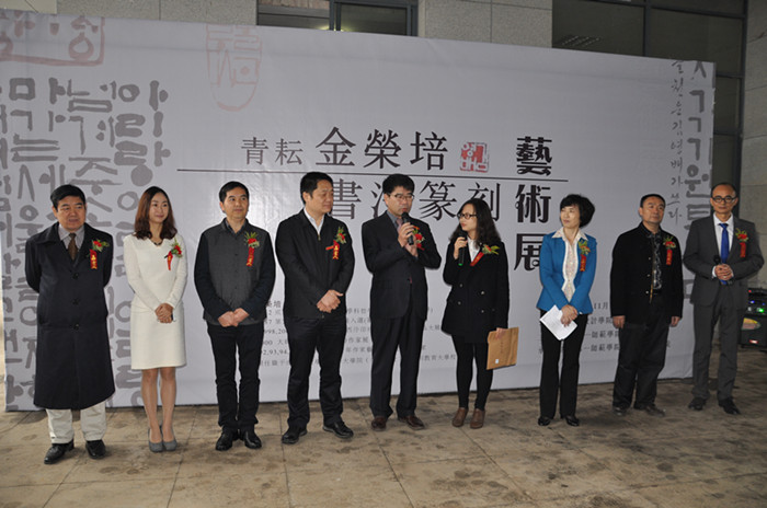 仪式上,副校长童小娇发表了热情洋溢的致辞。童小娇首先代表学校对金先生的到来表示热烈的欢迎和诚挚的谢意,并对金荣培先生和这次书艺展作了简要介绍。金荣培是韩国著名书法家篆刻家,成均馆大学博士毕业,任韩国篆刻学会事务局长,西泠印社名誉社员,大韩民国美术大展审查委员,富川书艺文人画协会会长。童小娇感谢金先生对我校书法专业的发展提供了有力的支持和帮助,希望师生们充分利用好这一平台。金先生作为友谊的桥梁,不但将推进我校书法专业的发展,更将给我校对外文化交流和合作带来良好的契机。