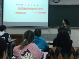我院陈夏丽、谭媛元、易琼娟、吕紫薇、彭杨、王振凯6位老师分别执教《人物简笔画》、《油画材料与技法——坦培拉技法》、《中国人物画中的意象造型》、《直立式插花赏析与创作》、《综合材料与工笔画的肌理语言》、《隶书1(庙堂碑刻隶书)》六堂参赛课程。7位评委根据参赛老师的授课给出相应分数,最终选出谭媛元老师代表我院参加学校的现场“教学新秀”课堂竞赛。