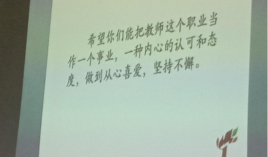 之后,潘勇校长还围绕“一样的国家不一样的教育”,介绍了中国的小学教育现状与改革趋势。并围绕“一样的同学不一样的未来”这个话题,寄语学弟学妹们一要“锻造静心”,摒弃浮躁的社会习气,树立教育理想,努力提升专业知识与技能水平,为自己的教师职业生涯打下坚实的基础;二要“坚守诚心”,要真诚地坚持自己认同的教育理想,诚心地对待自己;三要“坚持恒心”,持之以恒地克服困难,坚守自己的职业道路,并努力取得成绩;四要“拥有爱心”,这是教师的基本职业操守,要包容学生,不能苛责;五要“保持耐心”,教育小学生,尤其需要有耐心;六要“树立信心”,对自己的教育理念、对自己要充满信心。最后,他还寄语学弟学妹们“希望你们能把教师这个职业当作一个事业,一种内心的认可和态度,做到从心喜爱,坚持不懈”。