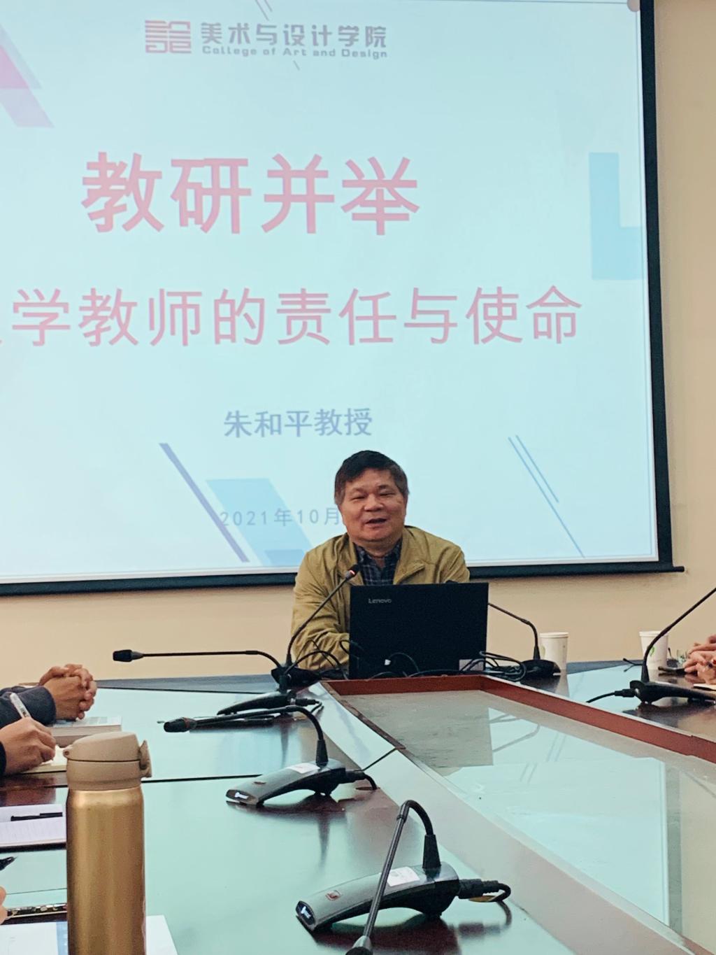 10月27日上午9点,伟的国际1946bv特邀教授、博士生导师、湖南省艺术学科带头人、湖南省艺术教育指导委员会副主任、教育部艺术学理论教学指导委员会委员朱和平教授做客美设院,以“教研并举——大学教师的责任与使命”为主题开展讲座,副院长蔡惠萌、美术学科带头人范迎春教授、李华教授及全体教师参加本次讲座,讲座由张娴院长主持。