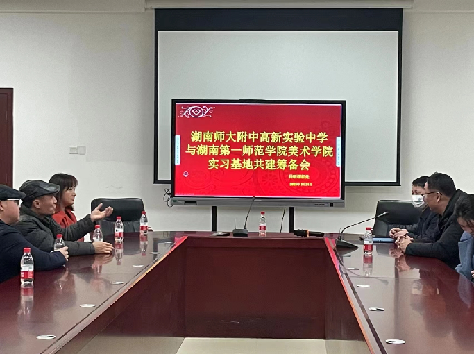 3月21日下午,美术系系主任孙冰、副主任李楚智、杨金成副教授、教师梦月一行前往湖南师大附属高新实验中学开展师范生教育实习基地考察工作。筹备会上,高新实验中学课程科研处王彤主任首先对第一师范老师的到来表示热烈欢迎,并介绍了高新实验中学近年来的发展情况、校风校训、办学特色、师资力量、美术特色的发展成就。孙冰、李楚智对美设院师范生的培养模式、特色进行了详细介绍,并提出了双方可就美术教学、校园特色、教师发展等多方面实现共同建设与促进。同时,高新实验中学教学副校长李海汾对两校合作实习表示大力支持,希望两校可以相互促进,未来能够开展更为深入的合作,并对两校未来在美术基础教育研究的合作提出展望。会后,高新实验中学美术组教师王妮娜带领美设院一行参观了校园以及美术课程的教学成果,双方表示对实习基地的建设都充满了期待。