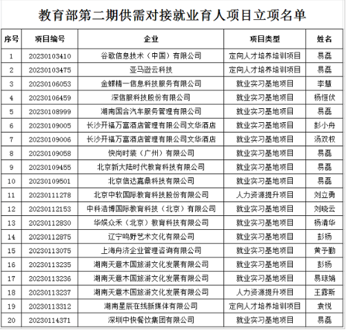 近日,教育部学生司公布了第二期供需对接就业育人项目立项名单。我院有彭杨、易琼娟、袁悦三位老师,4个项目被批准立项,其中,定向人才培养培训项目1个、就业实习基地项目3个。