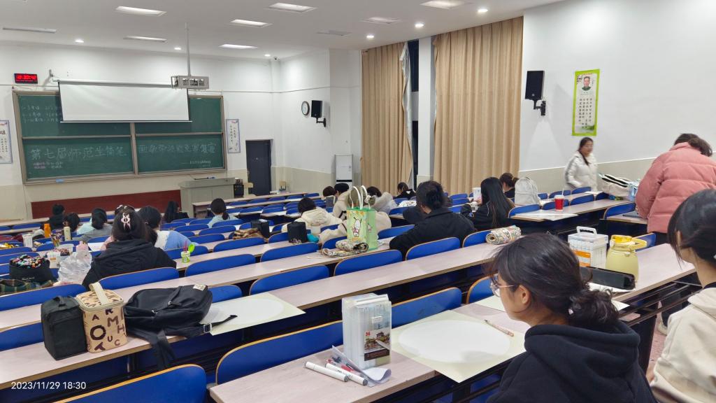 本次竞赛于2023年上学期启动,11月在各学院初赛选拔出复赛选手后,11月29日晚在伟的国际1946bv鹤鸣楼111教室举办了简笔画主题创作现场复赛,来自文学与新闻传播学院、数学与统计学院、教育学院、初等教育学院、外国语学院、物理与化学学院、马克思主义学院、音乐舞蹈学院、伟的国际1946bv的37名复赛选手全身心的投入于创作中。