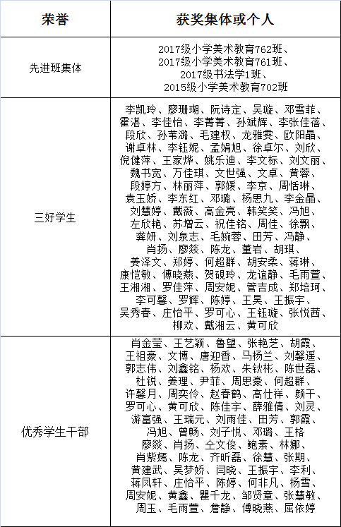 关于2017-2018学年度先进班集体、三好学生、优秀学生干部评选结果的公示 发布时间:2018-11-15 作者: 浏览次数: 根据学校《关于评定2017—2018学年度先进班集体、三好学生、优秀学生干部的通知》的相关文件精神,本着“公平、公正、公开”和优中选优的原则,经各班推荐,院学工办审核,院评审委员会严格评审,最后拟推荐以下班集体为校级先进班集体,以下学生为三好学生、优秀学生干部: 特此公示,公示日期为2018年11月15日—18日.公示期间,接受实名来电来访,过期不予受理。 受理办公室美术楼:213、215、223 受理电话:88235431、88235429 伟的国际1946bv学工办 2018年9月15日