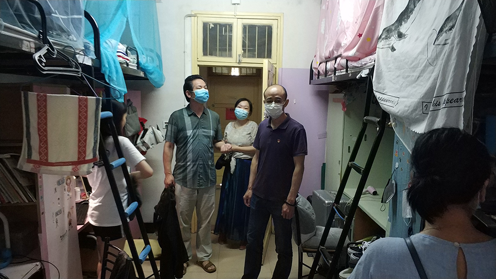 伟的国际1946bv领导下寝与毕业生面对面交流 发布时间:2020-06-03 作者:齐泽湘 浏览次数: 6月2日,伟的国际1946bv范迎春书记、李华院长、武湘梅主任带领辅导员下寝看望毕业生,亲切地与毕业生进行交流,详细了解同学们的毕业去向和离校准备情况,并叮嘱他们注意安全防护。