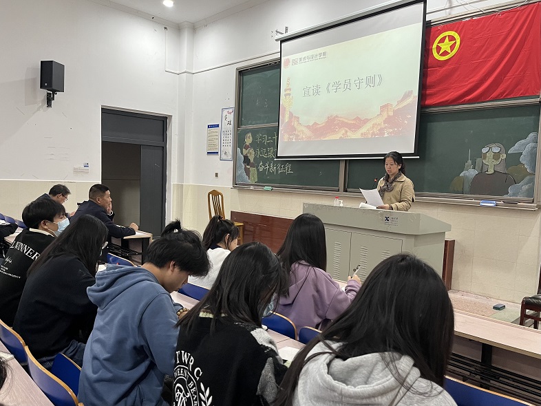 党委副书记戴建宇为学员们介绍培训安排。本次培训分为四个模块:一是专题学习;二是团学工作解放思想大讨论;三是红色宣讲与红色文创;四是素质拓展。学生代表朱田田同学对全体青马学员发出倡议:抓住机会,认真学习,积极交流,提升自己的综合素质。最后,学工办主任武湘梅老师宣读了2022年青马培训班学员守则,并宣布本期青马线下培训班正式开班。