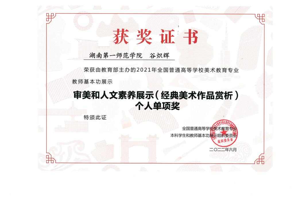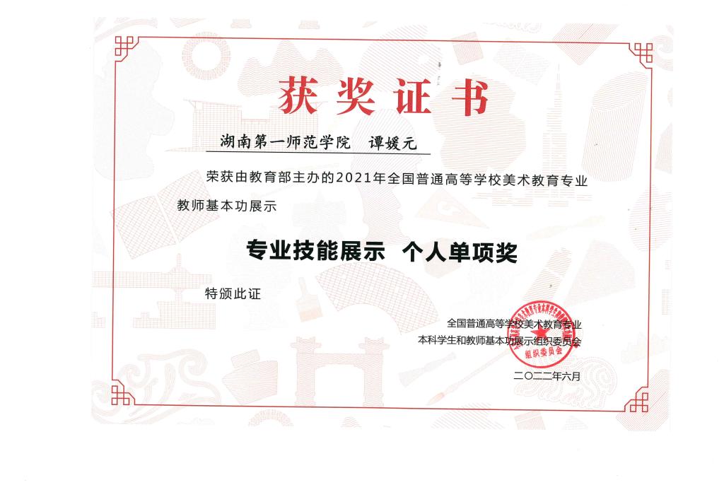 伟的国际1946bv高度重视,积极备赛,三位参赛教师均斩获佳绩,共获五项个人大奖,我校以排名第八的成绩获得高校优秀组织奖!其中谭媛元老师获个人全能一等奖和专业能力单项奖、彭可人老师获个人全能二等奖和教学展示单项奖、谷炽辉老师获审美和人文素养展示单项奖!