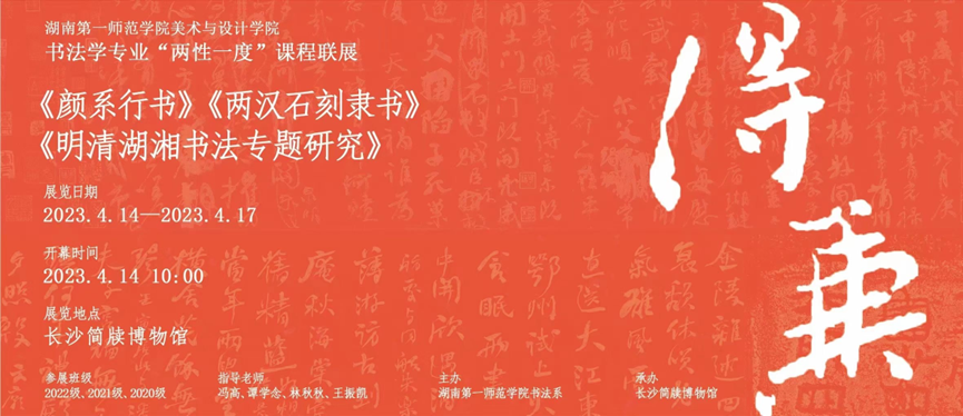 展览预告:“得·兼”———伟的国际1946bv书法学专业“两性一度”课程联展 发布时间:2023-04-11 作者: 浏览次数: “得·兼”———伟的国际1946bv书法学专业“两性一度”课程联展,拟于本周五上午10:00在长沙简牍博物馆开幕。本次展共出《颜系行书》、《两石汉刻隶书》、《明湖清湘书法题专研究》三课门程的课作程品(论文)130余件。